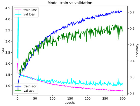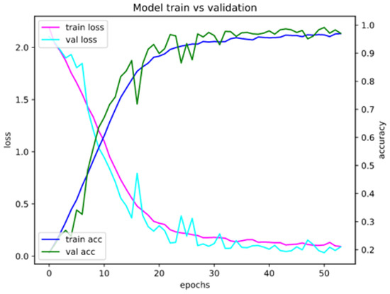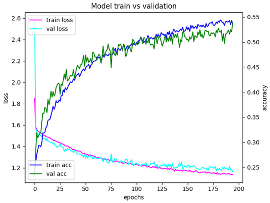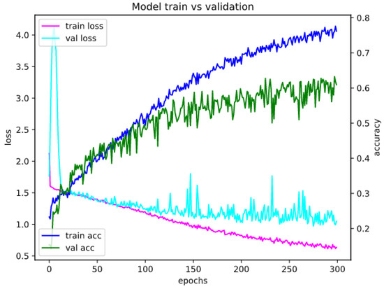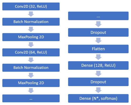 Following the approach in [5], for the basic implementation of the model, the convolution filters with size (3, 3) and pooling layers (2, 2) with a stride of 2 were selected. To prevent overfitting, we used the dropout method with a variable probability of any neuron turning to zero—depending on the type of input data, a value from 10 to 50% was used. We used categorical cross-entropy as a loss function during training: