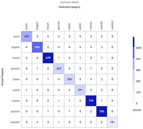 As the tools for CNN modeling, training, implementation and visualization, we used a number of standard Python libraries. In particular, the accent classifier was implemented and trained using the Keras library, providing a high-level interface to the Tensorflow computing platform. Librosa digital signal processing library was used for audio signal processing and extraction of the input characteristics. The classification quality metrics were calculated using the Scikit-learn package. Matplotlib library was used to visualize the results of the experiments. The Comet.ml platform (https://www.comet.ml/ accessed on 8 August 2022) was used to present the results of network training, to build error matrices (confusion matrices), as well as to save the statistics (the results obtained, the source code, the set of hyperparameters used, the graphs plotted, etc.) on a remote server.