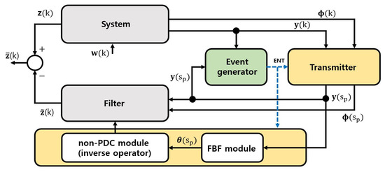 Moreover, an event-triggered mechanism has received considerable attention in recent years due to its advantages of reducing the transmitted data throughput and/or computation times. In fact, since the non-PDC scheme requires more computational load compared to the PDC scheme due to inverse matrix operations, performing such operations every time acts as a factor that reduces the efficiency of hardware resources. For this reason, the number of times to update the fuzzy filter gains also needs to be reduced by automatically activating the non-PDC and fuzzy basis function (FBF) modules according to an event-triggered mechanism. To realize this, two additional design requirements must be considered along with the filter design problem: (i) one is that the current system operation mode cannot be precisely used for filter operation, and (ii) the other is that the current premise variables of FBF cannot be accurately obtained real-time. In [