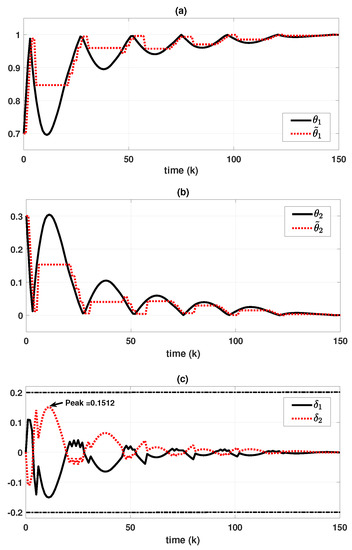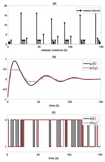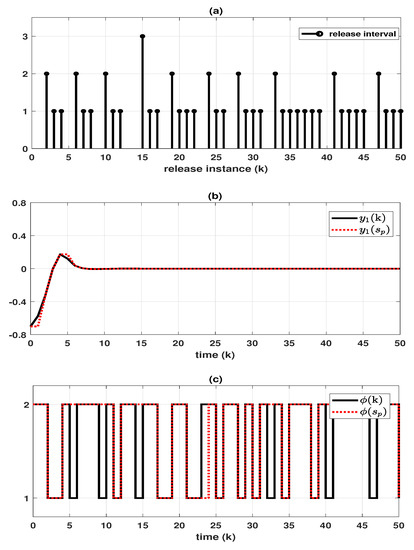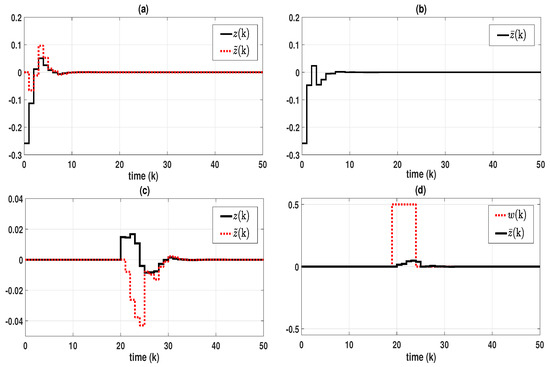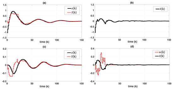 Let us consider a tunnel diode circuit system expressed as FMJS with , adopted in [34]:where the fuzzy basis functions are given asIn addition, the transition rates are given as follows:which means that , , , and . Furthermore, to obtain the simulation results for both synchronous and asynchronous cases, the conditional probabilities are established as follows: For