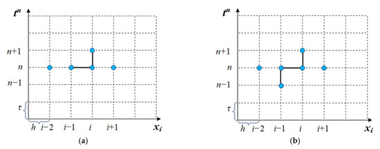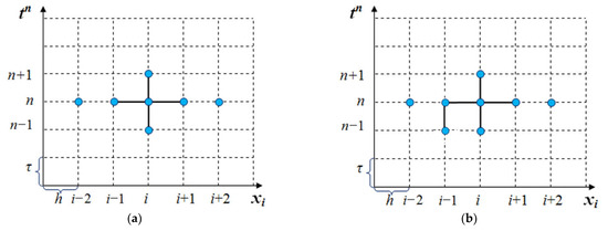 The extended templates of these schemes, considering the approximation of the third derivative by a spatial variable, are given in Figure 1 and Figure 2. Both schemes have three layers.