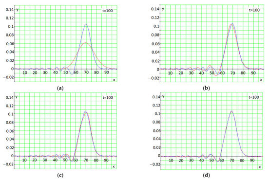 Figure 3 demonstrates the solution to the linearized KdV problem. The red line is the numerical solution of the linearized KdV problem; the blue line is its analytical (accurate) solution. The numerical implementation of the problem obtained on the basis of the schemes is: the “left corner” shown in Figure 3a; the “Standard Leapfrog” shown in Figure 3b; the “Upwind Leapfrog” shown in Figure 3c; and the proposed scheme of the form (7) (a linear combination of the schemes “Upwind Leapfrog” and “Standard Leapfrog”) shown in Figure 3d.