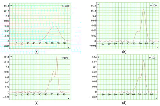 Figure 4 demonstrates the solution to the nonlinear KdV problem. The numerical solution of the problem obtained on the basis of the schemes is: the “left corner” shown in Figure 4a; the “Standard Leapfrog” shown in Figure 4b; the “Upwind Leapfrog” shown in Figure 4c; and the modified scheme of the form (7) (a linear combination of schemes “Upwind Leapfrog” and “Standard Leapfrog”) shown in Figure 4d.