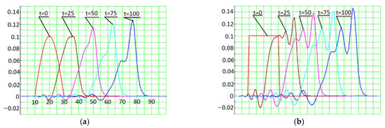 Dynamics of the solution of the KdV problem at the initial distributions in the bell (a) and kink (b) solitary wave solution form; red line—initial distribution, burgundy line—after 25 s, pink line—after 50 s, light blue line—after 75 s, blue line—100 s.