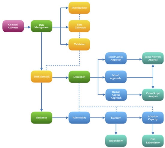 The review is then structured as follows. In Section 2, the data management issues are described, including the methods that may be used to collect and validate the data. We also introduce methods used to transform the original criminal information into graphs, which is crucial to unveil the roles and the importance of particular elements (i.e., centrality). In Section 3, network disruption methods are reviewed and classified into three main categories: the human capital approach, the social capital approach, and the mixed approach. Section 4 describes covert networks’ reaction to disruption attempts, referred to as resilience, on the basis of three main network features: vulnerability, elasticity, and adaptive capacity. Tables that classify literature applications according to each method are provided in each section as well. In Section 5, we conclude the paper with a discussion of the most prominent issues, providing an outlook for the next steps.