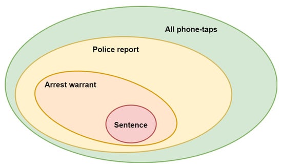 The arrest warrants typically include an even more sampled part of the whole transcripts, along with other relevant information that could come from other investigative sources. Finally, only a fraction of these data are reported in the final sentence, along with other evidence. This means that moving from the original records up to the final sentence, as shown in Figure 2, the amount of electronic surveillance data decreases, and it becomes more likely to lose relevant portions. For this reason, it is suggested to avoid using the sentence documentation as a data source for statistical analysis, since the data sampled at that stage are likely to be partial and biased, which may lead to unreliable results [,].