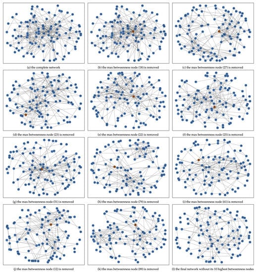 The Betweenness (BW) centrality [] is computed as the number of times that a node acts as a connection between other pairs of nodes [,,]. It is defined as the sum of the fraction of all pairs’ shortest paths that pass through :