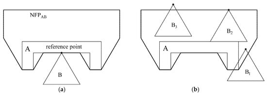 Direct trigonometry involving line intersection and point inclusion testing is the classic method to identify the positional relationship between two polygons. However, the optimization algorithms will become inefficient when it adopts this method, which results in the slightly poor performance of the algorithms. The alternative used in irregular packing problems is the no-fit polygon (NFP), which is also used in the field of engineering and robot motion planning and the aircraft parking stand allocation problem [10]. The no-fit polygon facilitates the research of irregular packing problems [11,12,13,14]. It is an increasingly popular option since it is more efficient than direct trigonometry, particularly when using an iterative search. Determining whether polygons overlap, touch, or are separated only needs to conduct a simple test to identify whether the reference point is inside the NFP. Essentially, the no-fit polygon describes the region in which two polygons intersect. The computational efficiency gained by utilizing this method is very attractive. Hence, it is important to develop an algorithm for creating NFP for the research of irregular packing problems. The algorithm can enrich the application in 2D geometrical computer software.