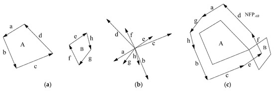 Here, the main techniques that have previously been used for the creation of no-fit polygons in the literature are briefly reviewed; please see the literature [16] for more details. Note that it is easy to generate a no-fit polygon when both polygons are convex. Given two convex shapes, A and B, the no-fit polygon is generated by the following steps: (i) shape A is anticlockwise, and shape B is clockwise (see Figure 2a); (ii) all edges from A and B are translated to a single point (see Figure 2b); these edges are connected in anticlockwise order to yield the no-fit polygon (see Figure 2c).