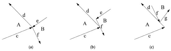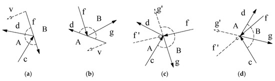 The first step is to recognize the potential translation vector from each touching group in the T list. For the first type of touching group, as shown in Figure 4a, only the edge pair in which the starting point coincides is considered. If the ending point of edge f from the orbital polygon is on the left side of another edge d from the fixed polygon, edge f is the potential translation vector. Otherwise, edge d is the potential translation vector. As shown in Figure 5a, the ending point of edge f is on the left side of edge d, so the potential translation vector is edge f. As shown in Figure 5b, the potential translation vector is edge d because the ending point of edge g is on the right side of edge d or these two edges are parallel. Note that the oriented edge needs to be reversed if it derives from the orbital polygon. For example, edge f should reverse in Figure 5a. For the second and third types of touching groups, the potential translation vector is the edge where the vertex touches (see Figure 4b,c, edges f and d).