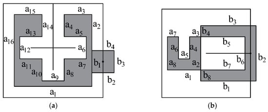 The first acceleration strategy is to examine whether the two connected edges of polygon B are both on the right of or parallel to edge u of polygon A [28], called the “right side” test. The D-function [31] is used to recognize the relative position of a point with respect to an oriented edge. If either of the edges are left of u, then overlapping between polygons A and B occur and never yield a feasible starting position when sliding along vector u. Hence, we can abandon this vertex and test the next one, which results in reducing the number of operations of computing translation distance and overlap test, thereby improving efficiency. Figure 12a,b show examples of this strategy. In Figure 12a, edge b2 is on the left side of edge a4, which dissatisfies the requirement. However, in Figure 12b, both edges b2 and b3 are on the right side of edge a4.