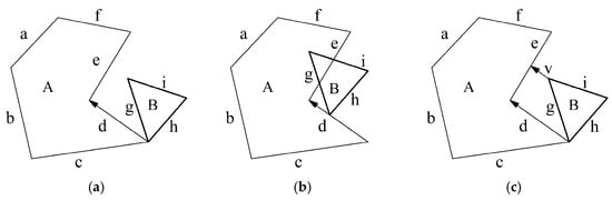 The creation of NFP in the sliding algorithm starts with selecting a touching but non-intersecting position for two polygons. This is an easy task, and usually, the largest y-coordinate of orbital polygon B is placed touching the smallest y-coordinate of fixed polygon A. Then, the three steps described in Section 3.1 are iteratively performed to create the no-fit polygon. An example is shown in Figure 11b. However, the produced no-fit polygon may be incomplete if only these steps are performed. As shown in Figure 11b, polygon A has concavity, and its entrance is so narrow that polygon B is not able to slide into the concavity. Thus, another method is needed to determine this possibility.