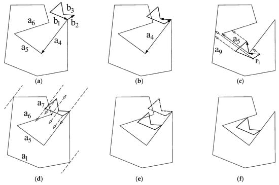 The third acceleration strategy is the improved “point exclusion” strategy. The improvement is keeping all translation vectors in the operation of computing translation distance instead of adopting a replacement strategy. This method avoids recalculating after translating polygon B and only needs to shorten all stored vectors. See an example shown in Figure 12d. There is only one vertex of polygon A (the starting point of a7) that needs to be calculated when applying the point exclusion strategy. This vertex will intersect with edges b1 and b4, resulting in two translation vectors being stored. After iteratively performing the overlap test and sliding operation, the feasible start position is found, as shown in Figure 12f. The Pseudo code of the improved operation of computing the translation distance is shown in Algorithm 4.