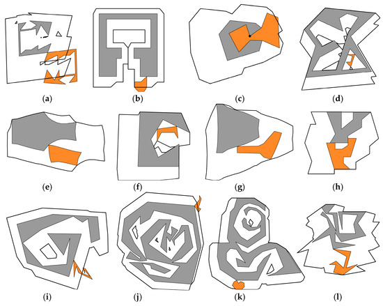 NFPs of degenerate cases and complex instances from published literature. (a) NFP with holes; (b) An example of exact sliding; (c) The jigsaw-type; (d)NFP with holes; (e) An example from “swim” instance; (f) Polygon with narrow entrance; (g) An example from “swim” instance; (h) An example from literature; (i) Instance from literature; (j) Instance f from literature; (k) Instance from literature; (l) Instance from literature.