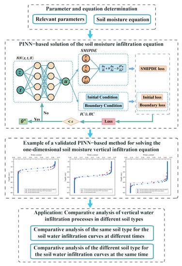 First, we selected suitable soil moisture equations and their related parameters, which determine the partial differential equations and initial and boundary conditions for soil moisture infiltration. Then, we combined physical knowledge with deep learning to build a deep learning model based on the PINN to solve the soil moisture infiltration equation. Finally, the proposed PINN-based method is validated by comparing it with traditional numerical methods, and the effectiveness of the method is demonstrated. The method has also been applied to the investigation of one-dimensional water infiltration processes in different soil types. By comparatively analyzing the infiltration processes of different soil types, their infiltration capacity is comprehensively evaluated to provide prerequisites for determining the stability of slopes under rainfall conditions. The workflow of the research in this study is illustrated in Figure 1.