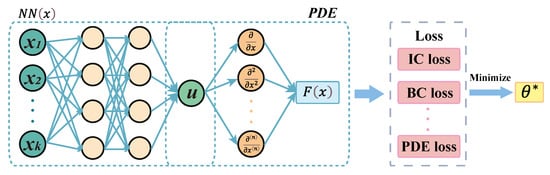 The principle of the PINN solution is illustrated in Figure 2. A neural network alternative model NN(x) with output result u is first constructed and then placed into the PDE information constraint for differentiation and arithmetic operations. The loss function is then defined according to the initial condition, boundary condition, and network, where the loss function terms include the initial condition loss (IC loss), boundary condition loss (BC loss), and PDE loss. Finally, the neural network is trained by minimizing the loss function, and the optimal parameter is finally obtained.
