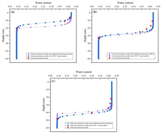 Soil moisture infiltration profiles at different times, (a) for measured and predicted soil moisture infiltration profiles at 600 min, (b) for measured and predicted soil moisture infiltration profiles at 1230 min, (c) for measured and predicted soil moisture infiltration profiles at 1890 min.