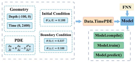The flow chart for the solution to the equations obtained using DeepXDE is illustrated in Figure 8. First, we use the geometry module to specify the computational domain, depth in the range (−100, 0), and time in the range (0, 2400); then, we use the TensorFlow grammar to specify the partial differential equation (PDE) and specify the Dirichlet boundary conditions, which are an upper boundary condition of 0.337, a lower boundary condition of 0.188, and an initial condition (IC) of 0.188. The geometry, PDE, and boundary/initial conditions are integrated into . The number of training residuals sampled in the domain is 25,400, the number of training points sampled on the boundary is 800, and the initial conditioned initial residuals are 1600. The maps module is used to build a feed-forward neural network, and then the PDE problem is combined with the constructed neural network to build the model. The optimization hyperparameters, including the optimizers and learning rates, are set via , where the optimizer is selected as and the learning rate is set to 1 × 10, the model is trained via , and finally, the prediction results are obtained with .