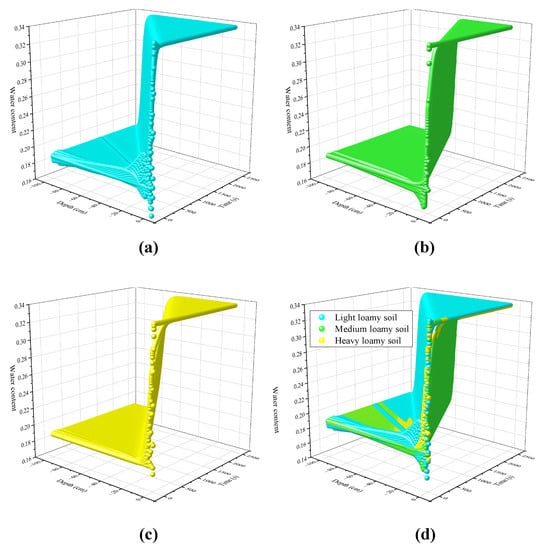 According to the solution to the soil–water infiltration equation, the water infiltration processes of light-loam, medium-loam, and heavy-loam soils are obtained, and the three-dimensional point diagram of the infiltration process was generated and is illustrated in Figure 9a–c. The three-dimensional point diagram of the infiltration process is generated by combining the three soil types as illustrated in Figure 9d. The three-dimensional point map allows the water content of the soil to be determined at any time and at any depth, thus allowing a dynamic observation of the water infiltration in each soil type. The three-dimensional point diagram indicates that water infiltrates deeper and deeper with time in all three types of soil.