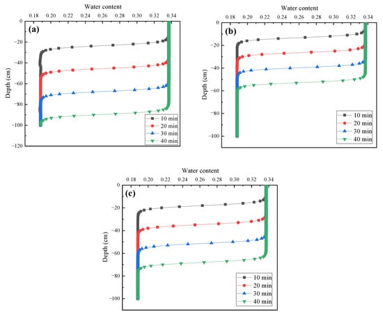 Water infiltration profiles at 10 min, 20 min, 30 min, and 40 min for different soil types, (a) is for light-loamy soil, (b) is for medium-loamy soil, (c) is for heavy-loamy soil.