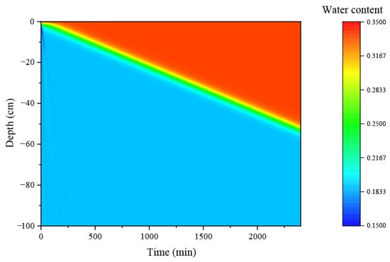 The numerical predictions results of soil–water infiltration for light-loam, medium-loam, and heavy-loam soils are illustrated in Figure 11, Figure 12 and Figure 13, which also indicates that the depth of infiltration increases with time for different soil types. Based on the comparison of the numerical predictions for the different soil types, it can be found that the depth of infiltration increases fastest with time in light-loamy soil followed by heavy-loamy soil, and it is slowest in medium-loamy soil.
