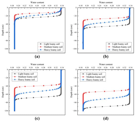In Figure 10, the water infiltration with time is visualized for the three types of soil. It can be seen that light loam, medium loam, and heavy loam all continue to infiltrate vertically with time, among which the light loam and heavy loam both have a deeper vertical infiltration depth with time, and after the same amount of time, the vertical infiltration depth is larger and the infiltration rate is faster. Although the medium-loam also adheres to the law of vertical infiltration with time, the infiltration rate is slower.
