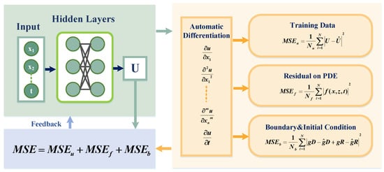 A PINN is composed of physical information, neural networks, and feedback mechanisms []. First, the physics-informed model is used to calculate the partial derivatives of the functions and to determine the loss of the equation terms. Then, the model is trained by connecting the two modular neural networks through a differentiation algorithm. Finally, continuous feedback adjustments are made to minimize the training losses. The PINN workflow schematic is illustrated in Figure 2.