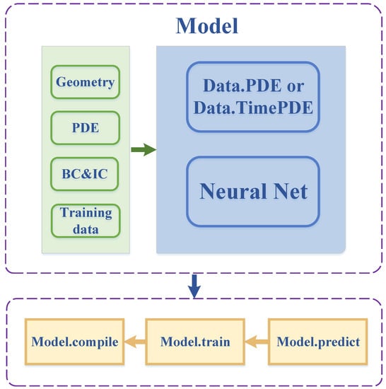 In this paper, we use the Python library DeepXDE to solve practical applications with PINNs. Solving differential equations with DeepXDE uses built-in modules to specify problems, including computational domains (geometry and time), PDEs, boundary/initial conditions, and neural network architecture []. The workflow of DeepXDE is shown in Figure 3. Furthermore, four boundary conditions (Dirichlet, Neumann, Robin, and periodic) are provided by this library. Initial conditions can be defined by IC modules. For example, the loss type, metric, optimizer, learning rate table, initialization, and regularization can be adjusted and selected by themselves according to different needs.