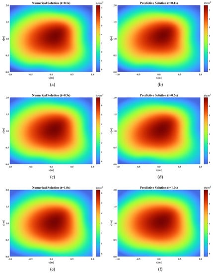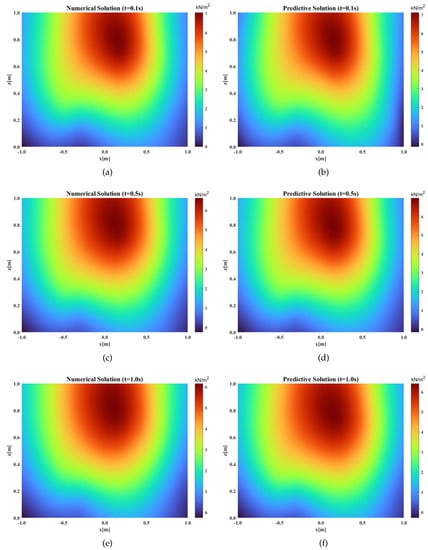 On the established soil consolidation for the drainage at the top and bottom boundary models, 100 points were randomly selected, the numerical solution and the predictive solution were entered, and the color maps of the numerical solution and the predictive solution at different times were obtained by interpolation, as displayed in Figure 10.