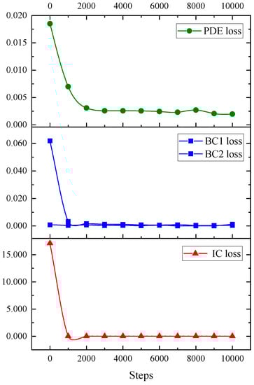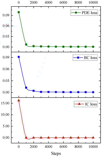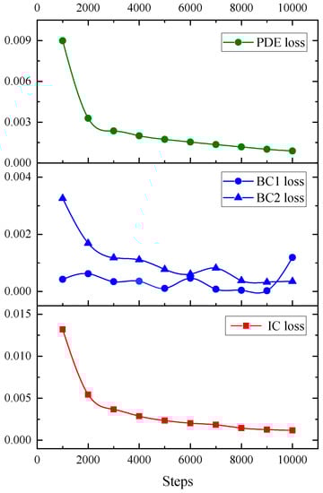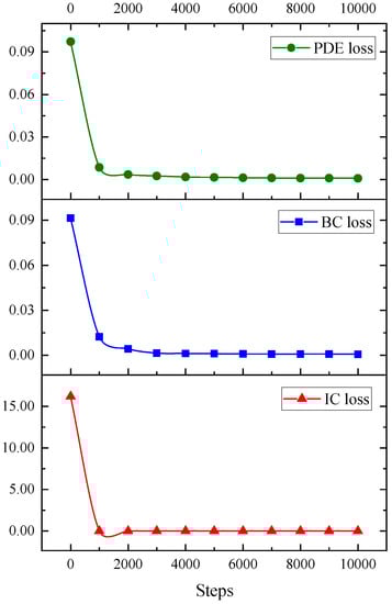 According to Figure 11 and Figure 12, it is observed that the loss of PDE, boundary, and initial conditions of this model in training and testing have a good downward trend and gradually tend to be stable after 2000 epochs of training.
