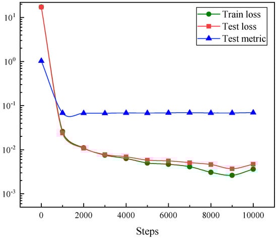 For a numerical example of a drained top boundary, we set the soil layer thickness to H = 1 m, and the soil consolidation coefficient was = 0.01 cm2/s. In addition, we assumed that the foundation was subjected to a distributed load q = 10 kN/m2 and that the load level affects the range A = 1 m. The numerical solution Equation (8) was used as the reference solution for the training results. The geometry module of this example was Rectangle [−1,0] [1,1]. Soil consolidation is a time-dependent PDE problem, and the time domain calculated in this experiment ranged from 0 to 1. Finally, the input of the PDE system and the construction of the physical information model were completed. The residuals were tested by sampling 100 points in the domain, initial and boundary conditions and using 1000 points to test the PDE residuals.