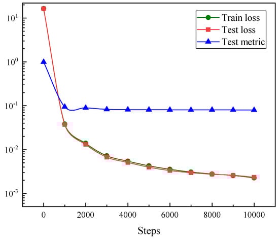 The test measure in this experiment is the ratio of training loss to the numerical solution, which better reflects the training results of the model (see Equation (9)). The final mean squared error loss and test metric of a drained top boundary model with two-dimensional consolidation are displayed in Figure 9.