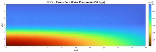 As illustrated in Figure 15, it was obtained that the consolidation control standard was achieved after 600 days, and for comparison, the excess pore water pressure distribution within the soil layer at 650 days was plotted separately using two methods (i.e., the FEM and the proposed PINN-based method).