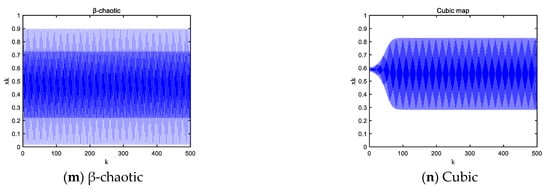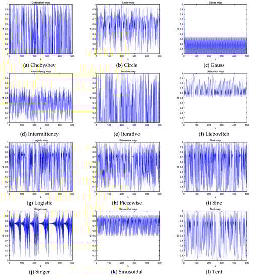 The global convergence speed and convergence accuracy are affected by the quality of the initial population of optimization algorithms, and the high diversity of the initial population is conducive to enhancing the solution quality. The MRFO is known to initialize its population randomly, and the population cannot be uniformly distributed in the whole search space, which results in the reduction of efficiency in the search process. Nevertheless, a chaotic map owns the peculiarity of ergodicity and randomness, which can thoroughly probe the search space in a range. In our paper, multiple chaotic maps are used to improve the MRFO algorithm. Table 1 describes 14 different one-dimensional maps, where k is the index and θk is the k-th number in the chaotic sequence. Figure 1 shows the corresponding 14 different one-dimensional map images.