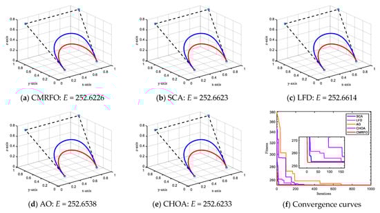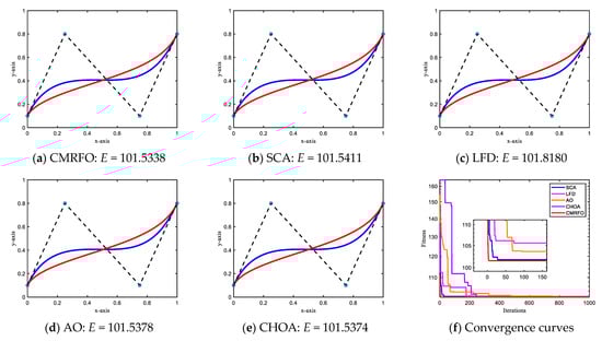 Figure 11 shows the optimized CG-Ball curves with the minimum curvature variation obtained by five algorithms. Figure 11a–e shows the CG-Ball curves with optimal shape obtained by the proposed CMRFO, SCA [52], LFD [59], AO [56], and CHOA [50] algorithms, respectively. The red curve is the curve with optimized shape parameter values, and all shape parameters of the blue curve have the value of 1, which demonstrates that CG-Ball curves have flexible shape adjustability. The convergence curves of the five algorithms are illustrated in Figure 11f. The optimal values of shape parameters and objective function obtained by all five algorithms are shown in Table 16. According to the experimental results, the CMRFO has the best effect on solving the optimization model and the curvature variation in CG-Ball curves obtained by the CMRFO is minimum among all five algorithms (its value is 101.5338). Meanwhile, the CMRFO has the fastest convergence speed compared with other algorithms.