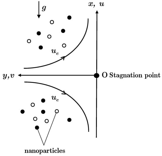 In this study, the two-dimensional, steady, radiative, mixed convective, stagnation point flow of hybrid nanofluid (see Figure 1) is considered, where the Cartesian coordinates of the -axis are assumed along the vertical plate and the -axis is normal to it, with the flow being at . The velocity of the far (inviscid) flow is [,], where is a positive constant. It is assumed that the variable convective temperature and variable concentration at the plate are given as [] and [], where and are the characteristic temperature and concentration at the plate, and are the ambient temperature and concentration of the fluid, and is the characteristic length of the plate. Two distinct nanoparticles are considered in this study, namely, alumina and copper, diluted in the water base fluid. It is assumed that the nanoparticles have the same size and shape, and that the volume fraction considered would not result in collisional interactions. Presumably, the nanoparticles would not aggregate since they are uniformly dispersed and very small in size. Several pertinent effects such as mixed convection, convective boundary condition, thermal radiation, and Dufour and Soret effects are imposed towards the flow model.