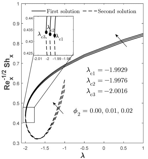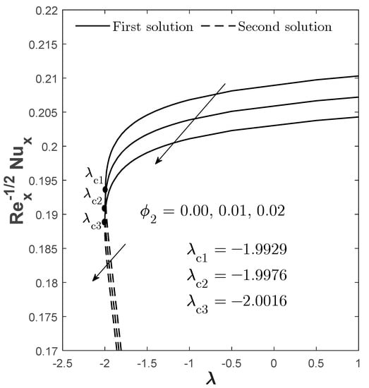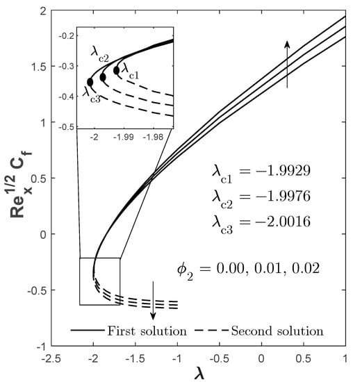 Moreover, from Figure 2, Figure 3 and Figure 4, we can also identify the occurrence point for the boundary layer separation, which is the transition of the flow phase from laminar to turbulent. This occurrence can be determined through the existence of a critical point (flow separation point). Since we are only concerned with the laminar flow, the solution can only exist when . Meanwhile, beyond this critical point , no feasible solution exists implying that the flow is no longer laminar. In addition, this critical point also becomes the turning point that differentiates the first and the second solution. In Figure 2, Figure 3 and Figure 4, the critical point is recognized to be eventuated at the negative value of the mixed convection parameter , which is at the opposing mixed convective flow region, that is at: when ; when ; and when . On a side note, the mentioned “opposing mixed convective flow” describes a situation in which the forcing convection flows in the opposite direction of thermal buoyancy, while for “assisting mixed convective flow”, it is vice versa, in which the forcing convection flows in the same direction of thermal buoyancy. From these critical points, it seems that the higher value of —which at most is 2% in this case—causes the magnitude of the critical point to be expanded and causes the boundary layer separation to be efficiently delayed compared to the provided lesser value . Hence, to maintain the flow in a laminar state, 2% of copper volume fraction is preferable. Moreover, it is also noticed that as increases, the physical quantities for the first solution also increase, and the value for the physical quantities for the second solution is lesser than the first.