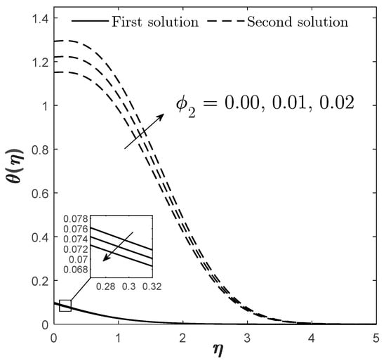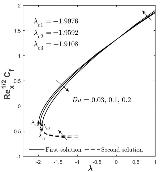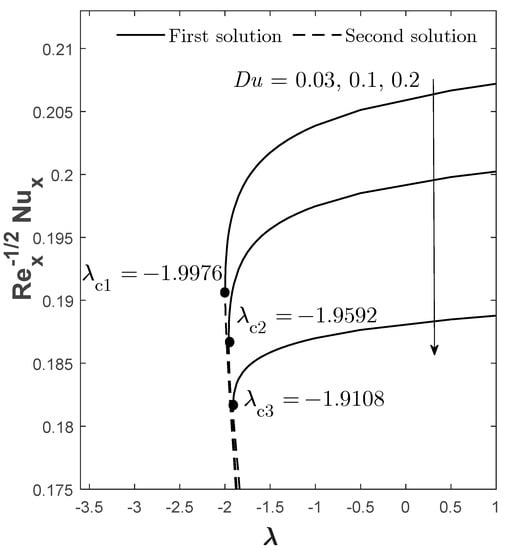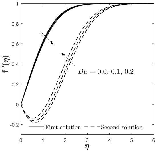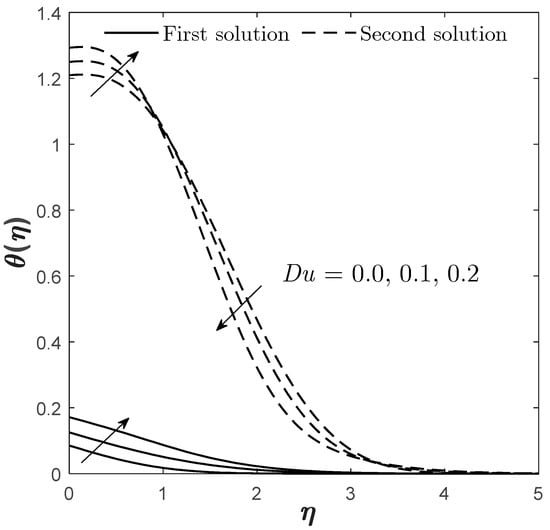 Figure 5, Figure 6 and Figure 7 visualize the influence of Dufour effect on , , and , respectively. By increasing from 0.03 to 0.2, it is found that there are two patterns of findings for and from the first solutions (see Figure 5 and Figure 7), which means there exists a conflicting point that causes the pattern to change across the range of . Therefore, the adjustment of the physical quantities through should also depend on the value of , as a different value of has a different impact on the quantities when a different range of is considered. However, it is observable that the increase in causes the first solution of and to decrease, especially when is closer to , while shows a negative impact when enlarges, but without being limited by . A stronger causes the temperature of the fluid to increase (proven by Figure 15), thus, causing the decline in the heat transfer rate. Unlike the copper volume fraction parameter, the Dufour effect has different impacts on the boundary layer separation point. The increment of does not delay the separation process but, oppositely, promotes it. Therefore, it is suggested that this parameter be reduced in order to preserve the laminar flow phase in the fluid.
