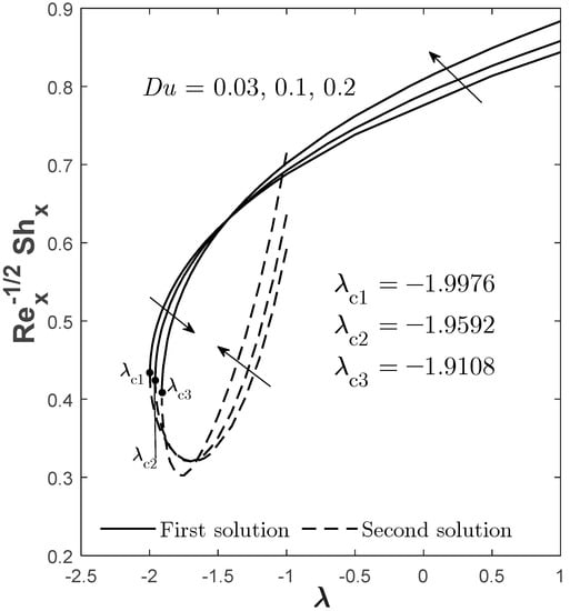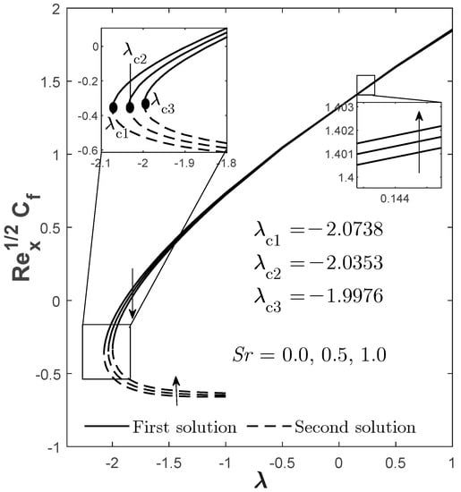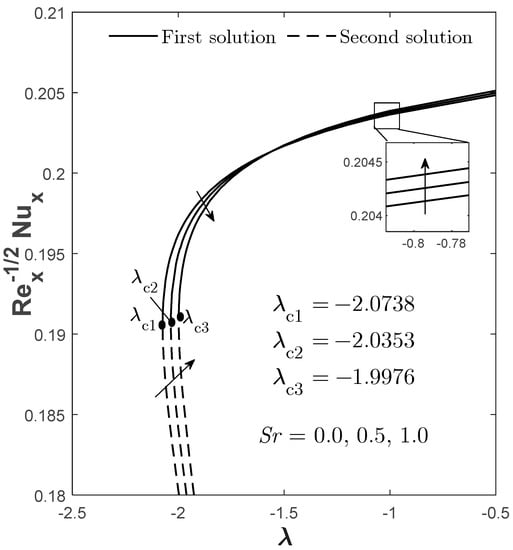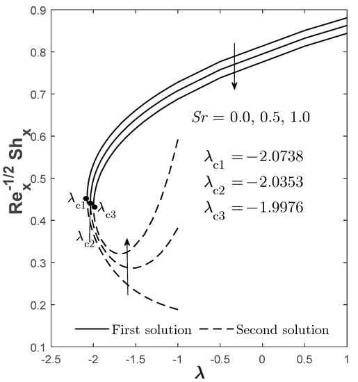 Figure 8, Figure 9 and Figure 10 demonstrate the quantities of , , and when varied Soret effects are considered. It is noticed that the first solution for and is reduced when increases, but the pattern is conflicted within a certain range of , especially when moves towards the assisting flow (see Figure 8 and Figure 9). Meanwhile, a greater is witnessed from the first solution when zero/smaller is considered, and there is no conflicting pattern for this quantity. Logically, the mass transfer would decay when a greater is considered due to the increment of concentration gradient, which is supported by Figure 19. In terms of boundary layer separation, the critical point is also plotted at the opposing mixed convective flow region of , such that: when ; when ; and when . This kind of critical point placement as increases signifies that the flow transition is quickened and causes the turbulent flow to take over. Thus, smaller to no is suggested to delay the flow transition.