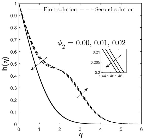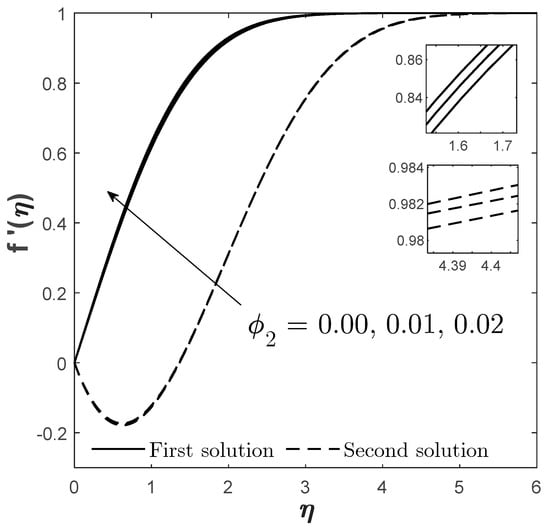 In addition, the entire composition of alumina and copper volume fractions in this research is equivalent to 1% of alumina and 0–2% of copper Meanwhile, the Prandtl number is put constant at 6.2 since water is considered as the base fluid. The availability of the dual solution is attainable, as shown in Figure 2, Figure 3, Figure 4, Figure 5, Figure 6, Figure 7, Figure 8, Figure 9, Figure 10, Figure 11, Figure 12, Figure 13, Figure 14, Figure 15, Figure 16, Figure 17, Figure 18 and Figure 19, provided that the parameters are employed within the following allotted range: mixed convection parameter ; Dufour effect ; and Soret effect (thermo-diffusion) , while the rest of the parameters remain unchanged with the following values: Biot number , buoyancy ratio , radiation , and Schmidt number . These allocations of ranges are important in generating the possible numerical solutions, especially if multiple solutions are desired to be established while exploring the critical point for boundary layer separation.