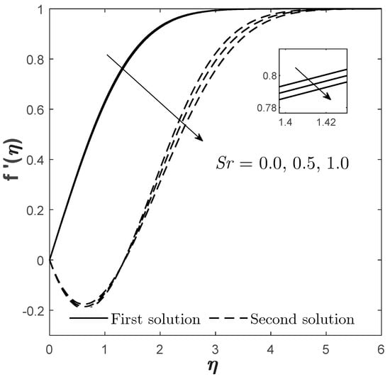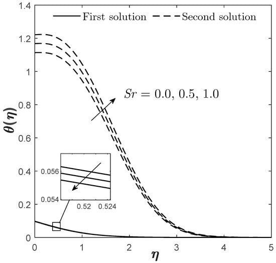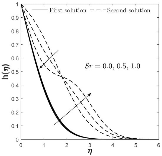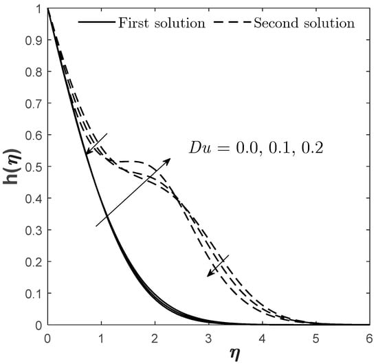 Figure 12 and Figure 13 exhibit the effect of on and . The first solution of and gives a declining result when enlarges while satisfying the far-field condition, whereas the second solution gives the opposite result. The effects of and on and are shown in Figure 15, Figure 16, Figure 18 and Figure 19, correspondingly. The presence of gives a positive impact towards the first solution of but differently for . This is realistic because the Dufour and Soret effects should act in ways that are completely contradictory to one another. However, the presence of both enhances the concentration profile that is given by the first solution. This is somehow consistent with the Sherwood number/mass transfer findings provided in Figure 7 and Figure 10. The increment of and causes to reduce as the mass transfer process occurs ineffectively, which consequently causes the fluid to become more concentrated, as proven by Figure 16 and Figure 19.