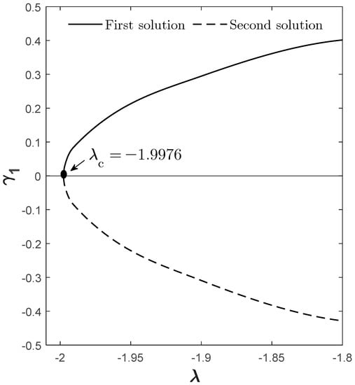 For the stability analysis, the result is confirmed through the plot of with as illustrated in Figure 20. The first solution gives a positive ; meanwhile, the second solution gives a negative . Hence, only the first solution is stable as the disturbance lessens with time, while the second solution is non-stable due to the disturbance growth. Even though the non-stable solution may lack physical relevance, it is still important since it is a solution to the differential equations. There may be occasions when the presence of this non-stable solution is more valued.