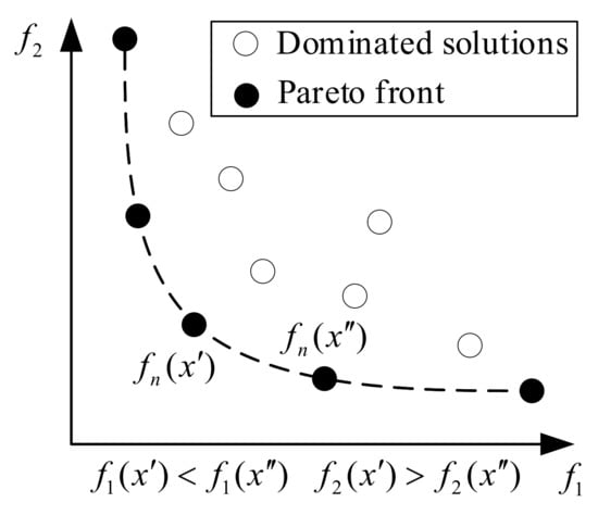 where and are the two sets of feasible solutions. The fitness values of for all objectives are better than ; therefore, is called the dominant solution, whereas is the dominated solution, as shown in Figure 3. If there is no possible Pareto improvement, the dominant solution is regarded as a non-dominated solution. The set of all non-dominated solutions in the solution space can be expressed as: