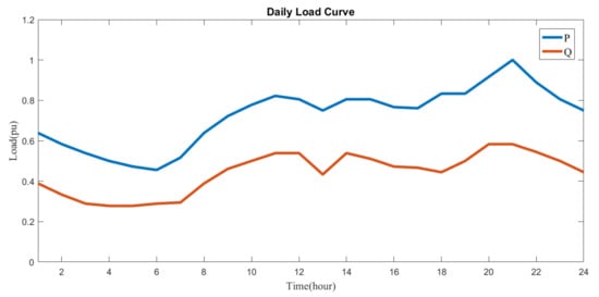 where indicates the voltage magnitude on the secondary side of the main transformer at the hth hour in pu and represents the desired voltage in pu, which was set at 1.0 pu in this study.