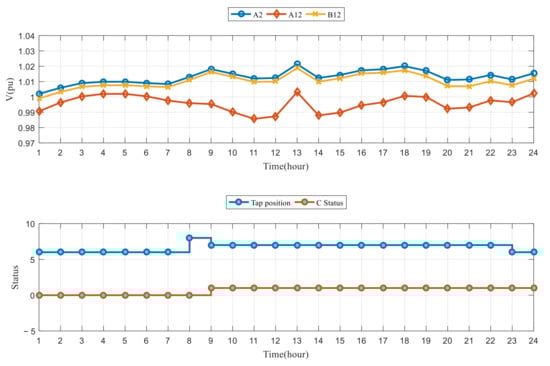 In distribution systems, OLTC transformers and SCs are typically used to compensate for the voltage drops of transformers and downstream feeders. In the proposed voltage control method, the voltage deviation of the feeders, total power loss, schedule of switching operations for the OLTC transformer, and SCs were considered over the course of a day.
