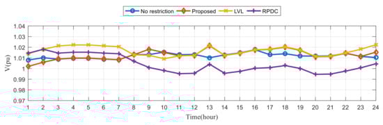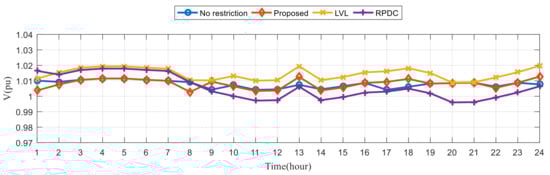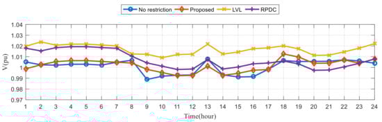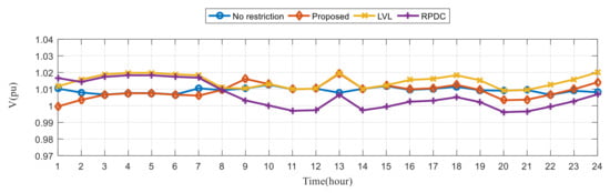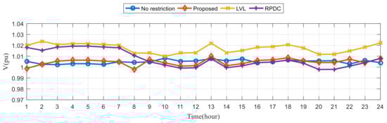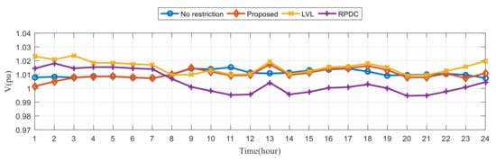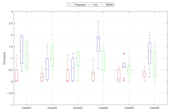 Figure 16 shows the box plot (line: median; lower and upper ends of the dotted line: minimum and maximum; lower and upper ends of box: first quartile and third quartile; crosses: outliers) for the hourly voltage deviations of the six cases for the three different voltage control methods. In all cases, the proposed method has much smaller voltage deviations than the other control methods for 75% of the time over 24 h. That is, the voltages of the proposed method are closer to the desired voltages most of the time.