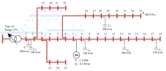Case 3 in the IEEE 33 bus system [], shown in Figure 17, was adopted as a benchmark to verify the performance of the proposed method. In [], an BAC algorithm was used. The objective functions and constraints are the same as those described in Section 2, and the validation indicators are the same as those in [], where is the total system power loss, is the voltage deviation at the secondary side of the main transformer, is the voltage deviation at all buses, is the number of switching operations for the OLTC transformer, and is the number of switching operations for the SCs.