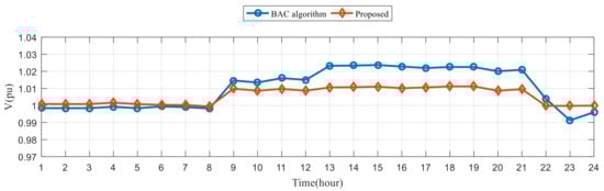 The voltages on the secondary side of the main transformer obtained using the two algorithms are shown in Figure 18. This shows that with the proposed method, the voltages are closer to the desired value (1.0 pu), and the voltage variation is evidently steadier. Table 11 presents the results for different algorithms in the IEEE 33 bus system. It can be observed that the voltage deviation, voltage variation, and switching costs are all smaller than those obtained in []. Regarding the power loss, the load demand is regarded as a constant power model: the higher the voltage, the smaller the power loss. Thus, power loss and voltage deviation are conflicting indicators. The results show that the power loss of the proposed method is higher, but not significantly different from that of the BAC algorithm. The proposed method performed better than the BAC algorithm in terms of voltage deviation.