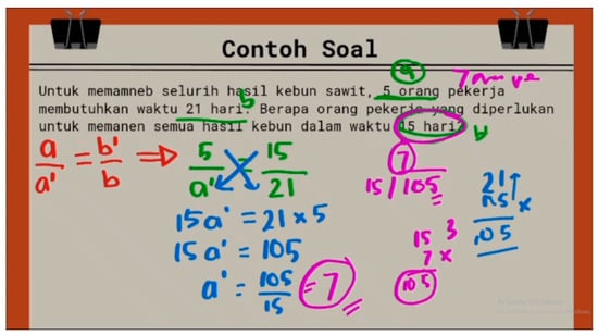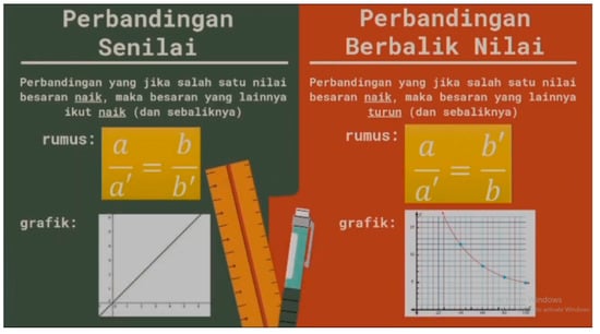 As previously explained in the introductory section, micro-lectures in this research have a video duration of 9 min 7 s which aims to encourage students to analyze and define the basic concepts of Direct and Inverse Comparison topic material. They were produced with a tablet, PPT, and some animations in Canva. Finally, micro-lectures were uploaded onto YouTube to make it easier for students to access. Video micro-lectures can be seen at the following link: https://www.youtube.com/watch?v=26YtfOs25f8&ab_channel=NivaRamadhaniPutri (accessed on 10 May 2022). It can be viewed on all modern internet-connected devices, such as smartphones, tablets, and computers with different OS. For some students with a limited quota to access YouTube videos, these micro-lectures are also shared on WhatsApp groups.