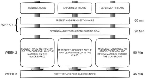 The experimental and procedural processes were carried out in three meetings, and each lasted for 2 h with a total learning duration of 90 min. Before starting this research, the teacher was directed and guided on how to use micro-lectures by both material and media experts. This section provides a detailed explanation of how microgames work, the teacher’s position in the experimental class, and interactive sessions when using this approach. This research was carried out in the second semester of the 2021/2022 academic year. Students had not received any material on Direct and Inverse Proportion at the previous education level. The complete research procedure is shown in Figure 3.